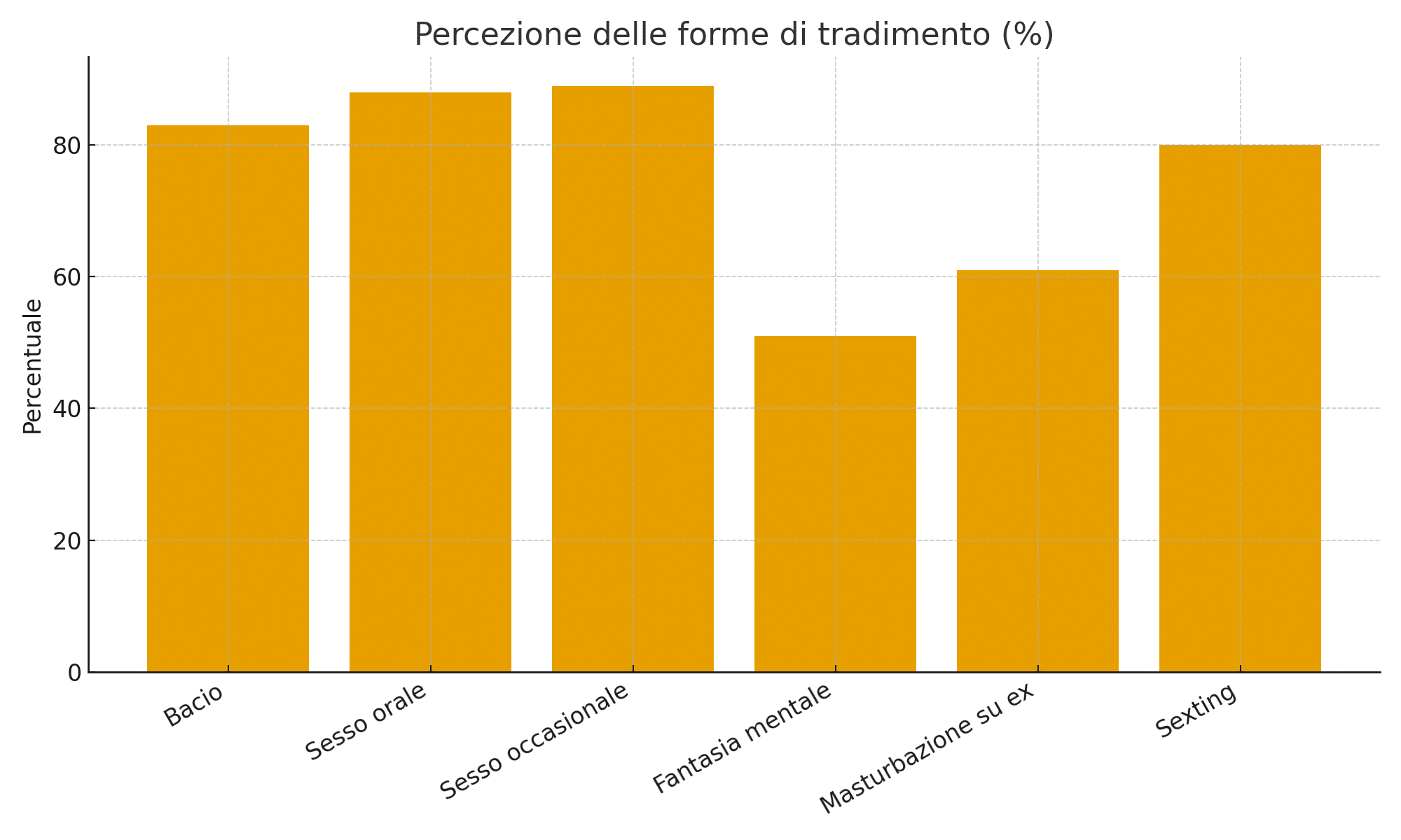 Il vero spartiacque si insinua però tra realtà e immaginazione. Per il 51% delle italiane, anche solo fantasticare o desiderare sessualmente una persona diversa dal compagno è già infedeltà. Un dato che sale al 61% se si considera l’atto di masturbarsi pensando a un ex amoroso, mentre addirittura il 67% identifica come tradimento addormentarsi tra le braccia del partner pensando a un altro. Prende corpo così il tradimento mentale, terreno spesso inesplorato ma che, secondo le testimonianze raccolte, logora profondamente il rapporto, forse più di molti gesti fisici.