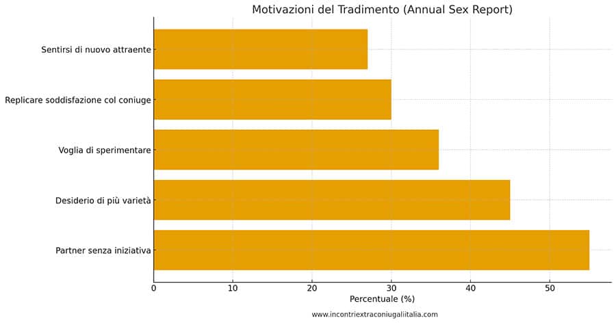 Basta uno sguardo alle cifre raccolte dall’Annual Sex Report  per capire che dietro ogni tradimento ci sono motivazioni multiformi. Il 55% degli intervistati lamenta un partner che non prende mai iniziativa. Il 45% dichiara di desiderare più varietà sotto le lenzuola, mentre il 36% ammette la voglia di sperimentare nuove esperienze.